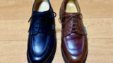 表面にごく細かなテクスチャーがあり、新品時はマット寄りの落ち着いた表情。手入れをしても鏡面のような強い艶は出にくく、履き込むほどに控えめで上品な光沢が乗っていくタイプ。革にハリがあるため最初は硬さを感じるが、そのぶん耐久性と形の安定感が際立ちます。